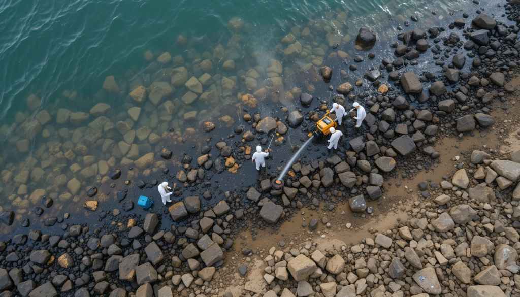 - Оборудование для очистки береговой линии: Если мазут все-таки попал на берег, приходится подключать тяжелую артиллерию: экскаваторы, бульдозеры, аппараты, которые бьют струей воды под высоким давлением, ну и, конечно, ручной труд никто не отменял.