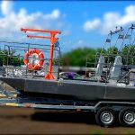 1-Корпус, 2-Леера, 3-Аппарель, 4-Рулевая рубка, 5-Лодочный мотор, 6-Весло. 7-Кран, 8-Лебёдка, 9-Якорь, 10 рундук.