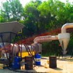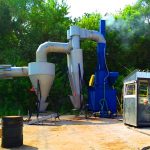 3.Отожженный нефтешлам попадает в камеру дожига, где крупные частицы (камни, твердые включения) по желобу выгружаются в приемную яму, где остывают и удаляются средствами имеющимися у эксплуатирующей организации. Более легкие частицы оседают в бункере выгрузного шнека, затем удаляются. Далее отходящие газы попадают поочередно в одинарный циклон и двойной, где пыль и мелкие частицы оседают в бункерах циклонов и удаляются шнеками.